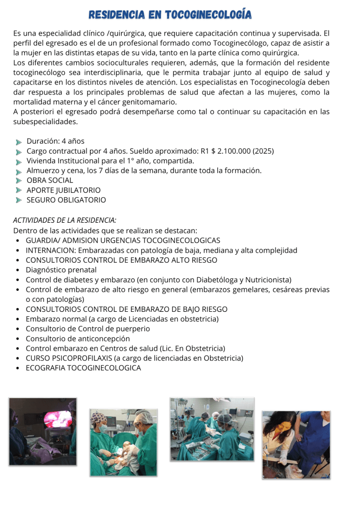 Con respecto a la actividad diaria: consultorios generales, patología mamaria, patología cervical, salud fetal, etc. Cirugías ginecológicas, incluyendo vía vaginal y laparoscópicas. Como residente de primer y segundo año cubrís internación, quirófano, consultorio y guardia; en tercer año Medicina Fetal, Ecografía, Patología Mamaria, Patología TGI y Alto Riesgo Obstétrico; en cuarto año: Cirugía General, Oncología Gineco, Fertilidad, Urogineco, Libre Ref, Interior, Internación, Quirófano, Consultorio.